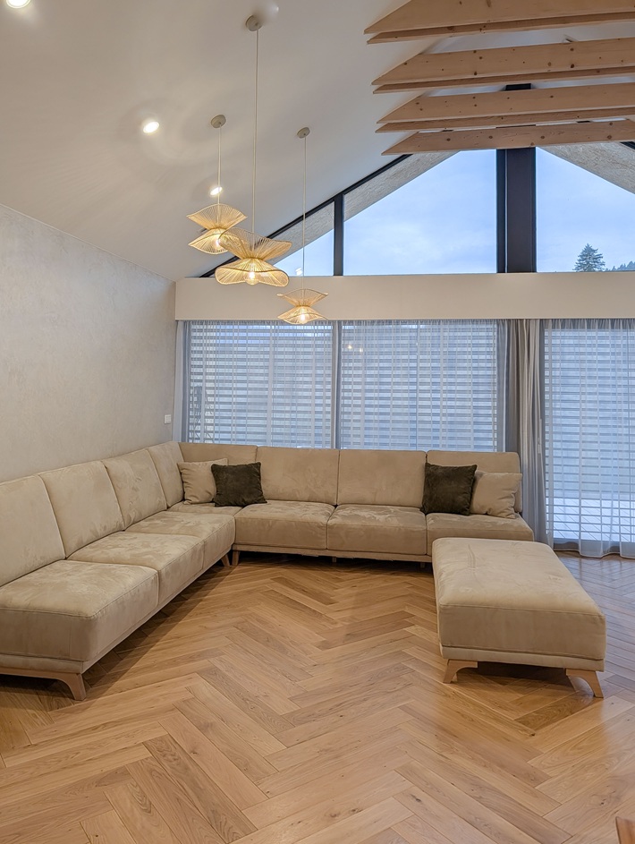 Už pri vstupe je cítiť hlavnú myšlienku celého interiéru – teplo prírodných materiálov a čistotu moderných línií. Dominantným prvkom je dekor dreva na schodoch, ktorý sa nesie naprieč celým horným poschodím a dodáva priestoru prirodzenosť i útulnosť. Výnimočným detailom je krásna drevená podlaha ukladaná do rybieho vzoru, ktorá interiéru prináša eleganciu a charakter.