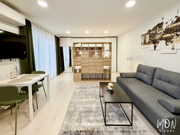 Dôležitým prvkom návrhu je deliaca knižnica zo svetlého dreva, ktorá nenásilne oddeľuje spací kút od dennej zóny. Zachováva otvorenosť priestoru, no zároveň prináša súkromie aj praktický úložný priestor. Tento prvok je ideálnym riešením práve pre jednoizbové byty, kde je potrebné citlivo pracovať s funkčnými zónami.